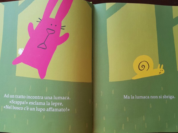 La prima ad essere sulla strada della lepre in fuga dal lupo affamato è una lumachina che si aggira per il bosco a passo di lumaca (come altro potrebbe? ^_*): “Scappa, scappa, nel bosco c’è un lupo affamato” grida la lepre aalla lumaca, ma lei non si sbriga…