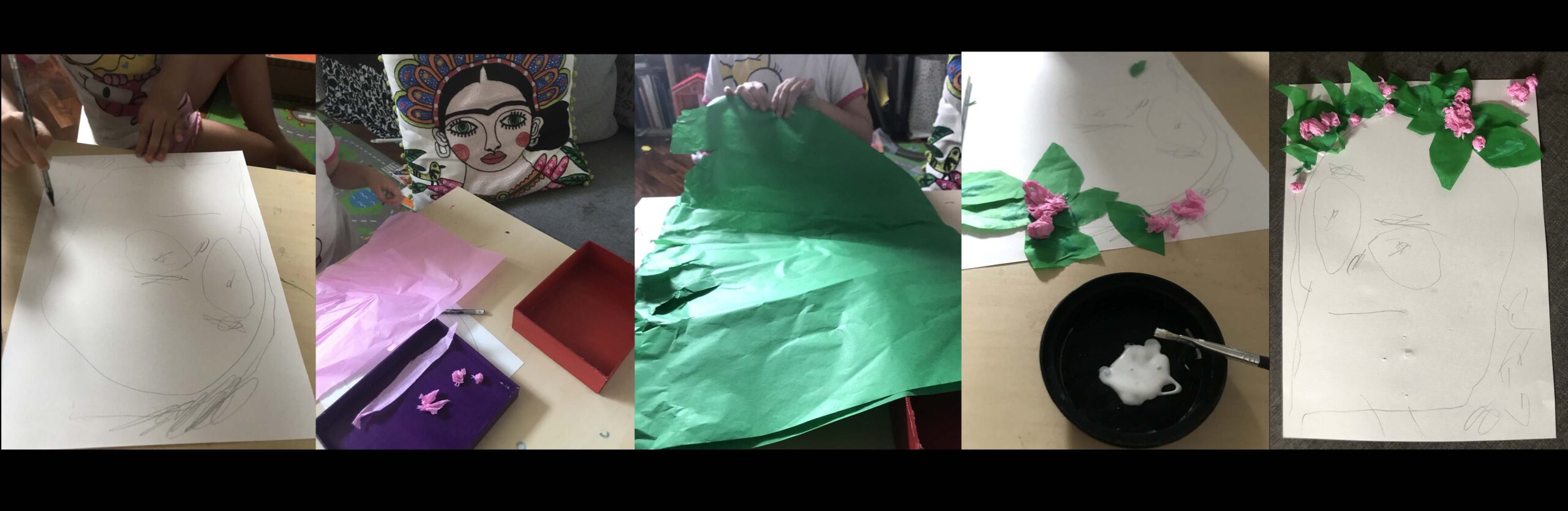 Successivamente creare dei fiori con la carta velina. Si inizia con semplici palline (bell’allenamento per la manualità fine per i più piccoli) e qualche forma più complessa da creare senza disegnare ma plasmando la carta (per i più grandi). Sempre con la carta velina, tagliamo delle forme che richiamino le foglie. A questo punto Concordiamo con il bambino di voler trasformare il suo ritratto nel ritratto di Me-Frida. Aggiungendo i fiori in rilievo.