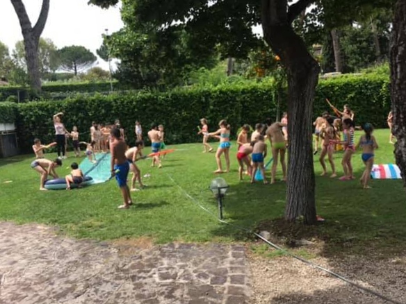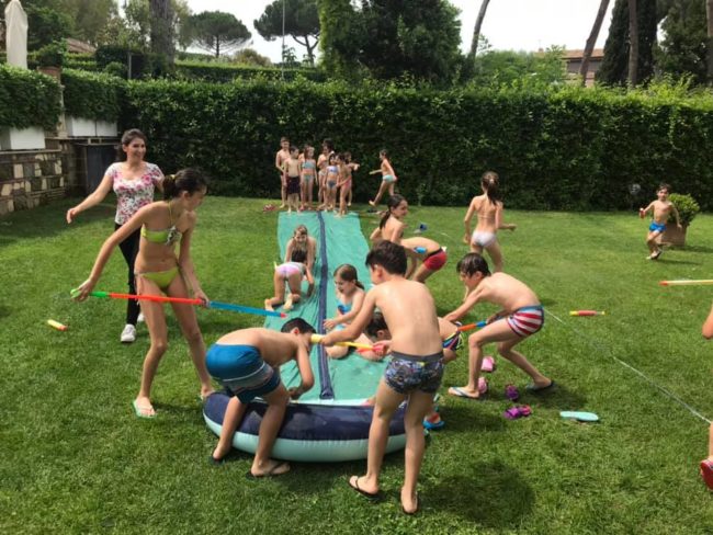 Poi la mattinata continuava con merenda a base di pizza e poi tutti a rinfrescarsi con i giochi d’acqua nello splendido giardino della Villa dei Cesari, dove per i bambini era predisposto un bellissimo scivolo e tante pistole ad acqua e palloncini pieni d’acqua pronti per scatenare vere battaglie: water game per tutti! Impossibile raccontarvi la gioia dei bambini nel descrivermi questo momento della giornata, il divertimento sano di un gioco semplice e immortale, la gioia di rincorrersi con i piedi sull’erba fresca del prato e l’acqua che rinfresca e da sollievo e allegria.