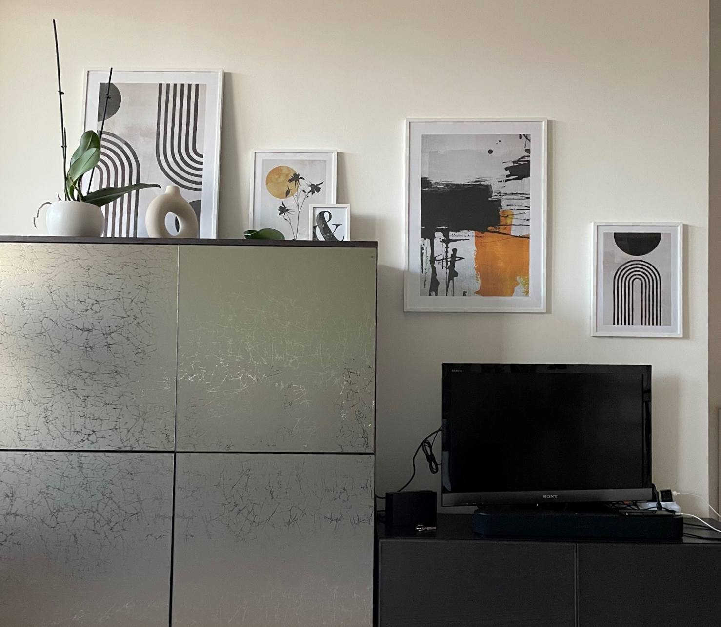 Nel nostro caso l’obiettivo era valorizzare la parete TV così abbiamo scelto di appenderne un paio uno più grande e uno più piccolo sopra la TV e appoggiarne sul mobile alto gli altri due, sempre di diverse grandezze. L’effetto abbastanza movimentato a me piace tantissimo ,e a voi?