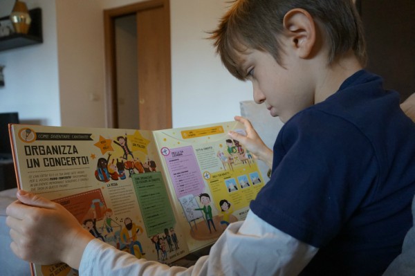 Voglio fare l’artista edito da Editoriale Scienza, offre spunti creativi davvero molto belli, Filippo ci si è trovato molto, sia per il fatto della pittura, perché ama disegnare da sempre e quest’anno in particolare sta frequentando un corso di arti visive imparando tecniche di pittura e studiando Picasso, ma gli è piaciuta anche molto la parte relativa alla formazione di una band e l’organizzazione di un concerto.