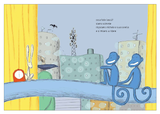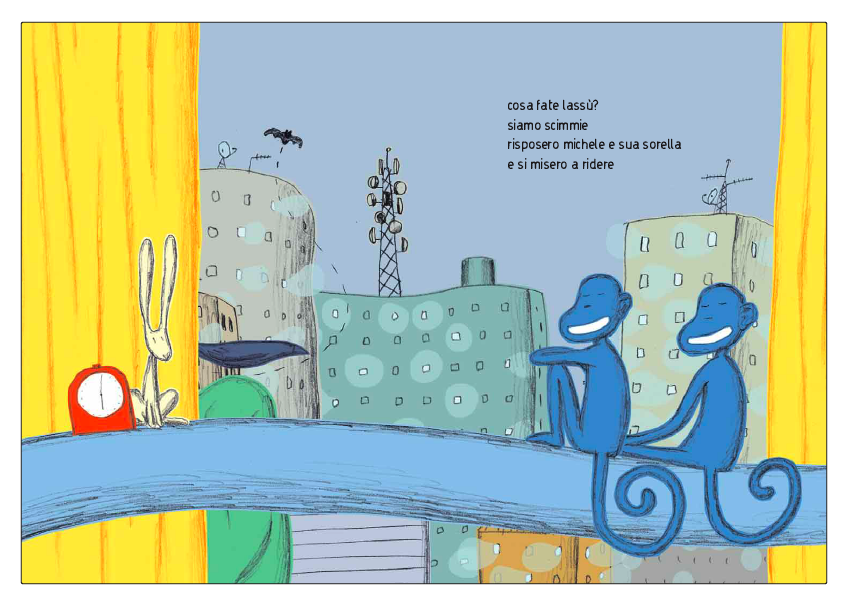 Ma Michele la convincerà a guardare le cose da un’altra prospettiva: i due fratelli si siedono su un armadietto della cucina e da lì osservano la stanza e i suoi ospiti, il rubinetto del lavello diventa la proboscide di un elefante, una giraffa passeggia per la cucina.. diversi animali si materializzano in cucina. Ma che succede? Succede che si immaginano cose e si può persino arrivare a sentirsi trasformati al punto che se la mamma chiama per la cena «sì mamma, risposero in coro le scimmie e scesero dall’armadietto».