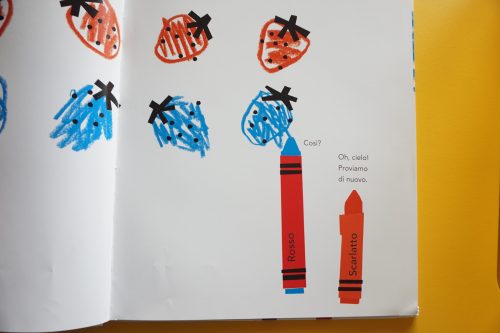 E’ quello che accade nel libro che vi racconto oggi, Rosso in cui i protagonisti sono dei pastelli a cera e in particolare il pastello rosso, che anziché scrivere rosso, come tutti si aspettano, scrive blu.