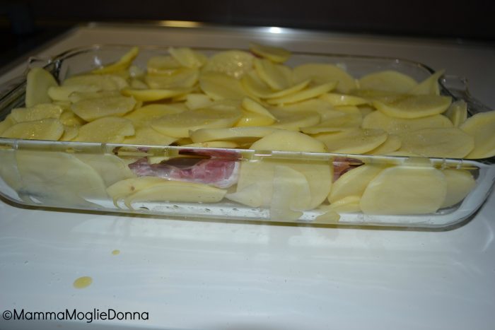 Oggi voglio raccontarvi come ho fatto il pesce al forno l’ultima volta. Prima di tutto si trattava di orata che mi son fatta pulire e sfilettare dal pescivendolo, poi ho tagliato le patate a fette sottili sottili e.. ho creato la composizione che vedete: uno strato di patate, uno di pesce, uno ancora di patate!