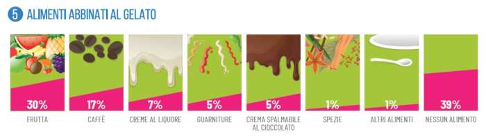 Ora veniamo alla parte divertente, la ricerca DOXA dice che l’abbinamento preferito del gelato è con la frutta (30%), anche se il 39% degli italiani non lo abbina a nessun alimento.