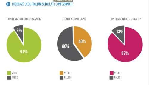 A proposito di credenze sui gelati confezionati, il 91% degli italiani è convinto che contengano conservanti, il 60% che contengano OGM, l’87% che contengano coloranti.