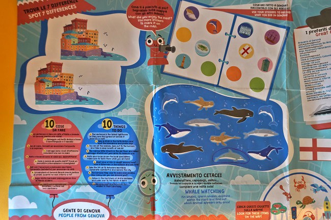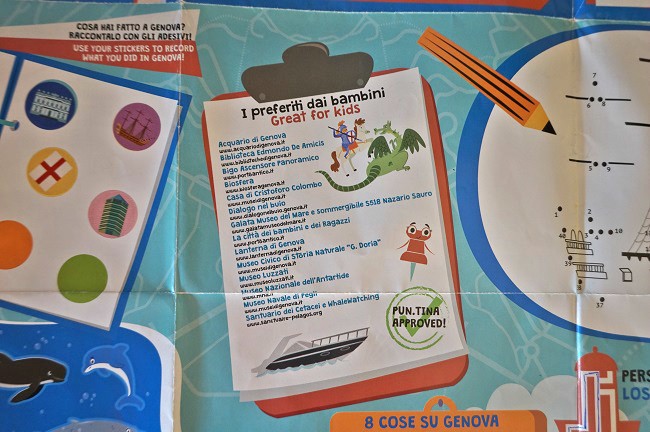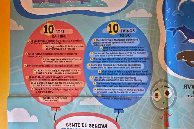 Accanto alla mappa giochi, note e attività per i bambini con la lista dei luoghi preferiti dai bambini: dall’Acquario, alla Biblioteca de Amicis, alla città dei bambini e dei ragazzi, alla Lanterna, al Museo Luzzati