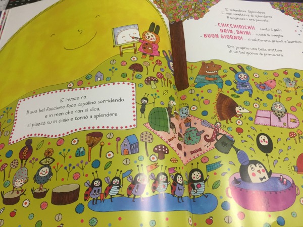 Il SOLE dopo aver fatto un enorme salto nel cielo, torna al suo posto e torna a splendere col suo bel faccino sorridente… e finalmente il gallo può fare il suo CHICCHIRICHI, la sveglia il suo DRIN DRIN e bambini e adulti possono salutarsi con il BUON GIORNO!