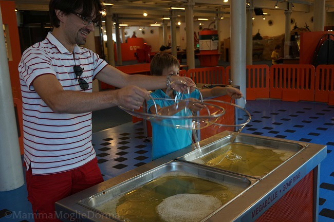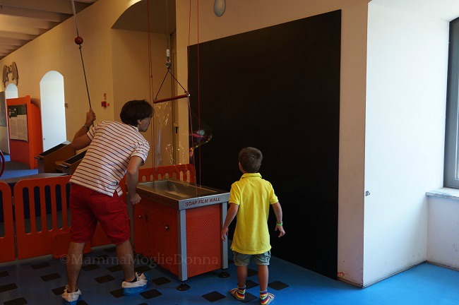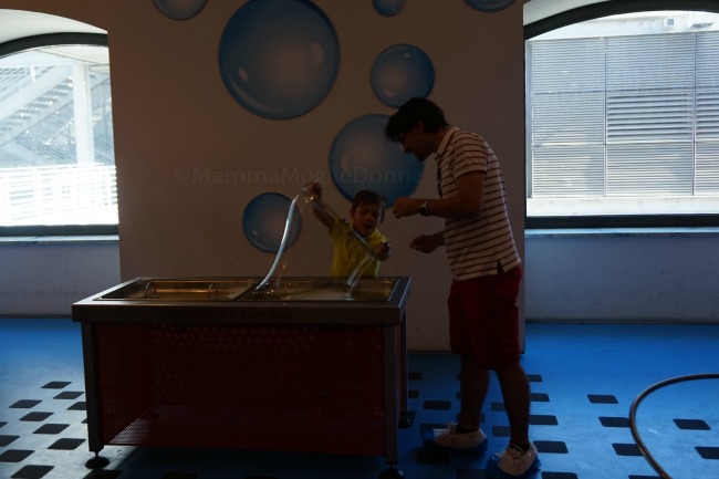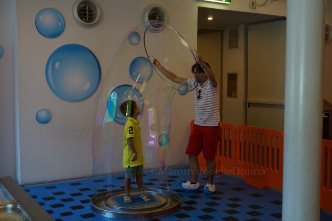 Questo è il mio spazio preferito, qui i bambini possono giocare con bolle di sapone enormi, muri di bolle di sapone, una bolla in cui in una bolla di sapone ti ci puoi avvolgere completamente, come hanno fatto Edo e il mio compagno…
