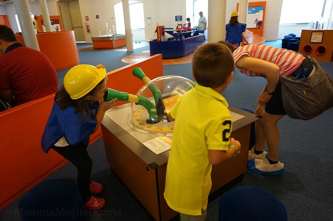 Poi lo Spazio TV in cui c’è la riproduzione di uno studio televisivo, l’area dedicata alle fonti energetiche rinnovabili, l’angolo dedicato ai laboratori con cui i bambini possono creare oggetti con materiali di recupero e liberarli nel tunnel del vento.