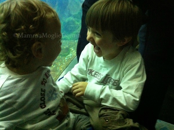 Se volete andare all’Aquario di Genova, il consiglio più importante, che sembra banale ma non lo è, è quello di acquistare i biglietti online. L’ingresso è assediato da file interminabili a tutte le ore, con il biglietto online eviterete la fila e nonostante sul biglietto sia indicato un orario, esso non è assolutamente vincolante.I bambini sono rimasti letteralmente estasiati alla vista di quei pescioni, anche Edoardo che temevo potesse annoiarsi, è rimasto rapito: batteva le mani, bussava sulle vetrate, salutava, saltellava.. era incontenibile, felice, eccitato.. E Filippo osservava attento intento a riconoscere i dettagli appresi dai libri..