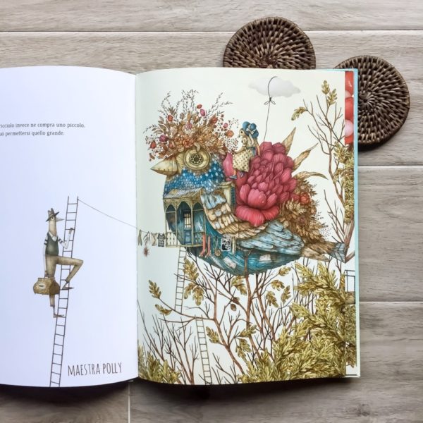 Carson Ellis ci guida attraverso una rassegna favolosa di abitazioni, tutte diverse e tutte plasmate dall’unicità e dalla peculiarità dei loro proprietari. Dal nido –appositamente posto sotto la dedica a marito e figli- prende il volo un uccello grigio, vero e proprio fil rouge di ogni tavola del libro, che porta il lettore alla scoperta di appartamenti, palazzi, case alte, case base, case serie e pazzerelle, nascondigli, maison francese, della casa della duchessa slovacca, del fabbro keniota, del Dio norvegese, dell’uomo della luna… per finire con un rimando personale: