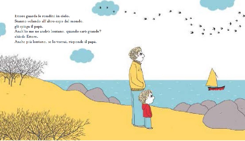 Quando sarò grande inizia con un dialogo padre-figlio in cui Ettore guardando le rondini in cielo che stanno volando dall’altra parte del mondo, chiede al papà se anche lui andrà lontano quando sarà grande. E il papà risponde “anche più lontano se lo vorrai”. Da questa risposta si capisce subito l’orientamento del papà che non cercherà in nessun modo di trattenere suo figlio, ma lo incoraggerà ad andare ovunque voglia, affrontando paure e difficoltà.
