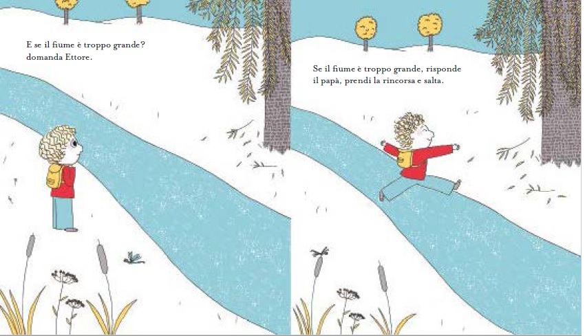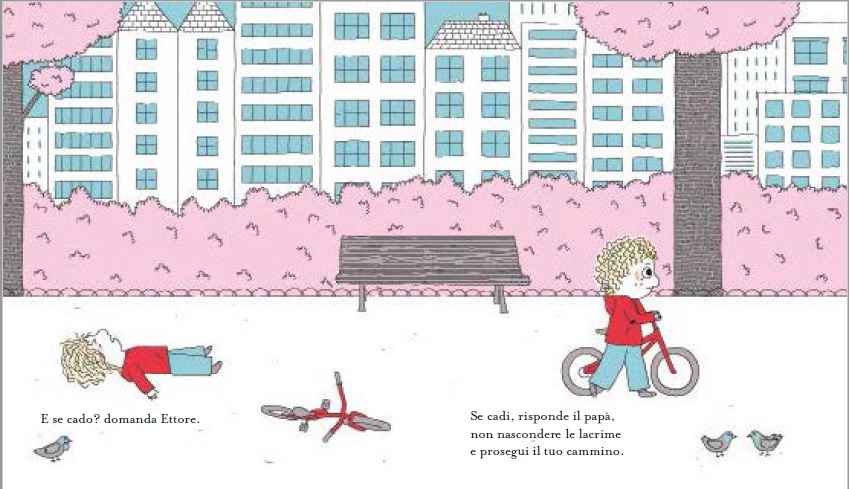 Ovviamente avrei preferito un libro in cui all’unisono i due genitori spronassero il bambino, non mi piace lo stereotipo della mamma affettuosa e il papà forte, ma questa volta concedo una possibilità a questo albo unidirezionale, perché c’è bisogno di ricordare ai papà che devono essere lo sprone dei figli, incoraggiarli anche senza tenere loro la mano sempre, dargli le ali con cui possano volare lontano anche dal papà.
