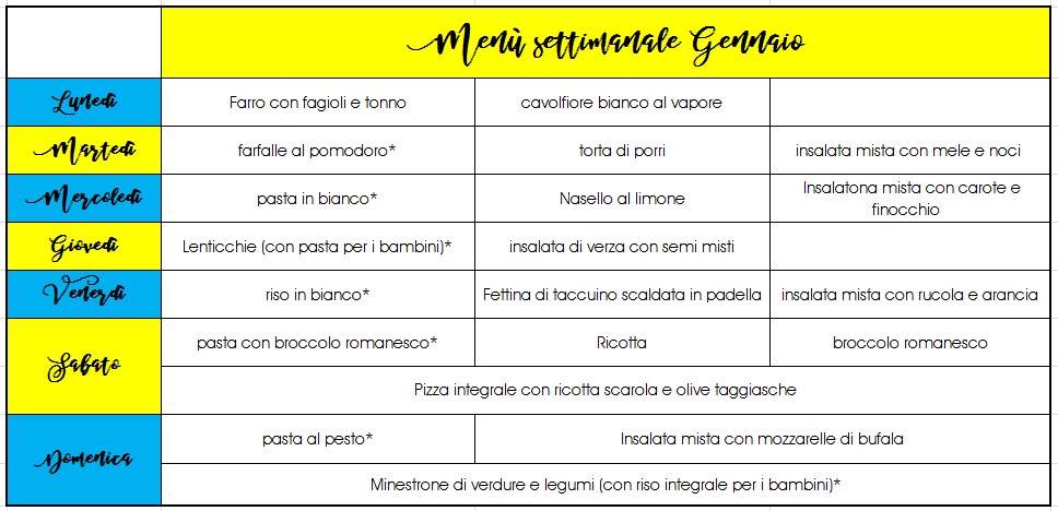 Ho preparato quindi un menù settimanale un po’ più rigido per noi grandi, e l’ho completato con quello che serve per fare un menù che vada bene ai bambini.
