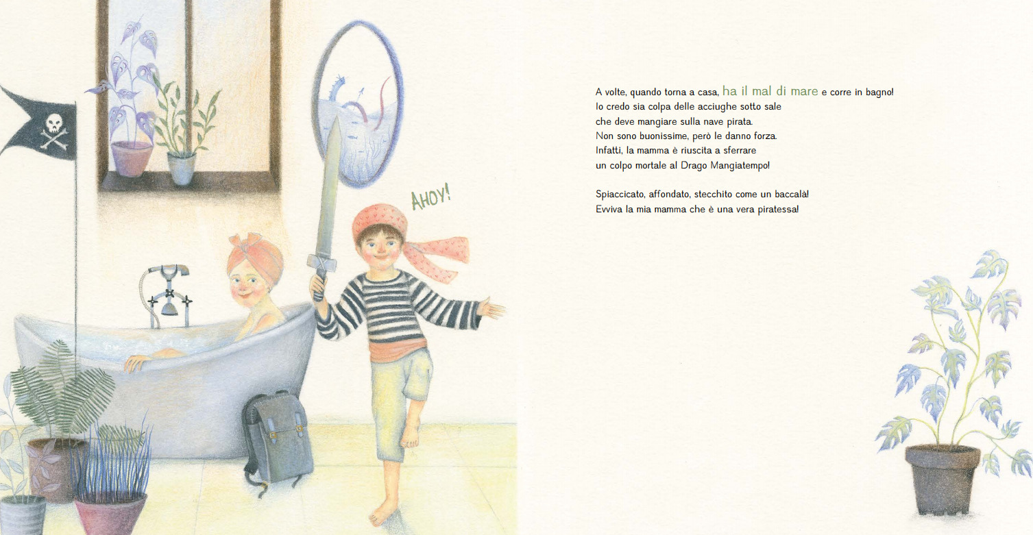 Non è un compito facile, ma è proprio da questa sfida che sono partite Isabella Paglia e Francesca Corso per dare voce ai personaggi di questo albo e illustrarne le vicende. Il risultato è nelle pagine di LA MIA MAMMA E IL DRAGO, che narra di una mamma guerriera alle prese con un Drago Mangiatempo, una personificazione della malattia che aleggia tra le pagine del libro, ma allo stesso tempo non fa mai davvero paura. Il figlio, protagonista della storia, infatti non lo teme fino in fondo, perché sa che solo le mamme sono in grado di combattere – e sconfiggere – questo tipo di creature.