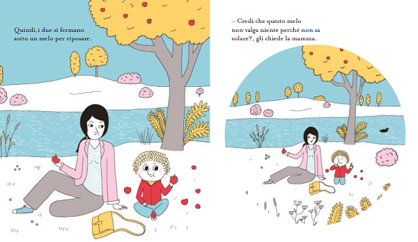 Allora la mamma lo porta a fare una passeggiata. Durante la strada gli mostra un uccellino sul ramo e gli chiede “Credi che quell’uccellino non valga niente perché non sa nuotare?” Poi incontrano una farfalla e mentre la osservano, la mamma gli chiede “Credi che quella farfalla non valga niente perché non sa cantare?”