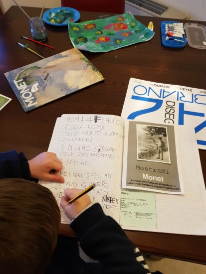 E non è detto che poi debbano per forza aver voglia di fare, Filippo aveva voglia di scrivere sul quaderno in cui scrive le esperienze in giro per Roma e mi ha colpito molto quando ha scritto che le opere di Monet non gli sembravano quadri, ma la realtà vera.