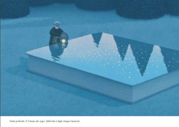 C’è un grande libro in cima a una collina, semiaperto, lascia intravedere un bagliore luminoso. Inizia così il viaggio del lettore attraverso immagini fantastiche, insolite e incantate, metafore visive di quella magia che si crea ogni volta che ci troviamo di fronte a una buona storia, catturati dall’energia di un libro. Ogni tappa del viaggio è uno scenario, ogni scenario ha per protagonista un libro. Immagini come enigmi, offerti al lettore affinché possa attribuirgli un significato, attingendo dal proprio mondo interiore.