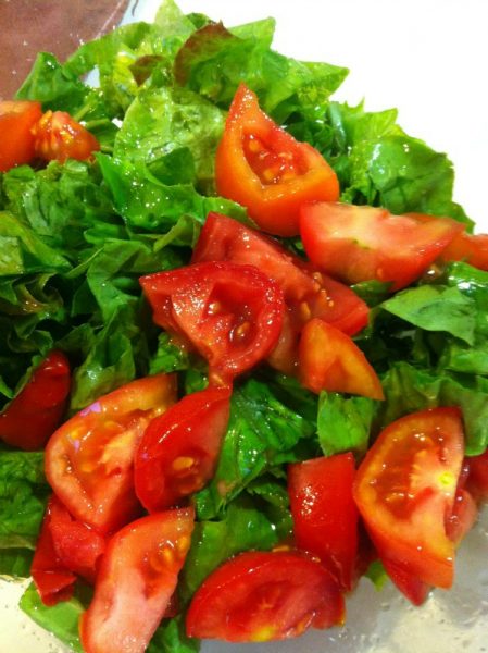 E ci siamo gustatai la nostra insalata con pomodori e le fragoline del nostro orto sul balcone