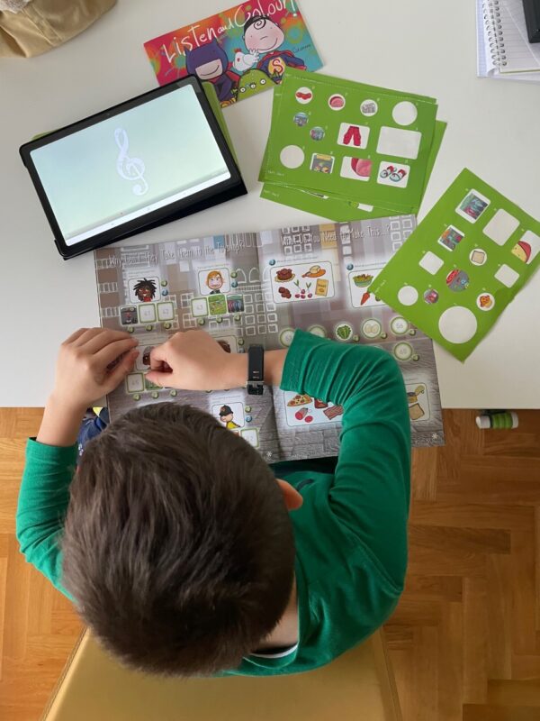 Dal di fuori io lo vedo felice di andare a lezione, sereno, soddisfatto quando torna, sempre entusiasta di fare attività di ascolto e giochi sulle app quando è a casa, ma la mia prospettiva non è quella dell’insegnante e avere la possibilità di confrontarmi con l’insegnante è qualcosa di completamente diverso.