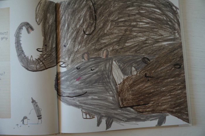 E poi c’è il grigio stanco di colorare enormi elefanti e rinoceronti e ippopotami e balenottere. E’ faticoso colorare animali così grandi così lo sfinito pastello Grigio chiede a Dante di poter colorare sassolini e cuccioli di pinguino e ciottolini.