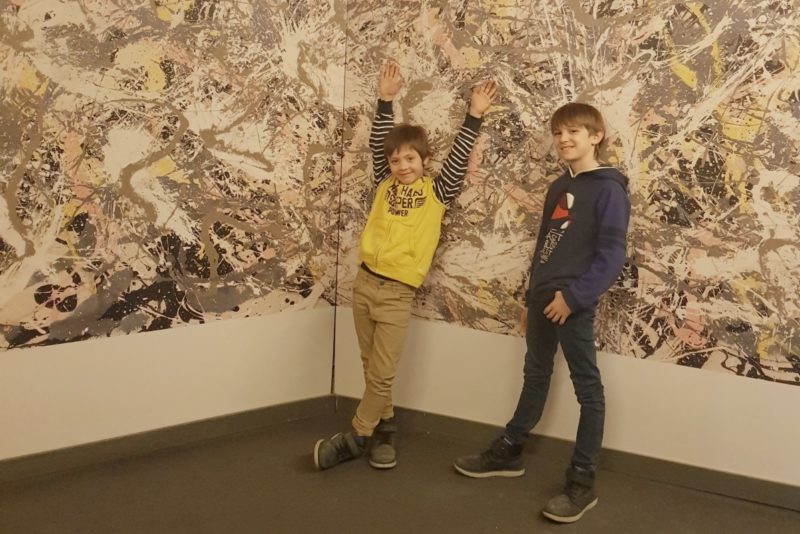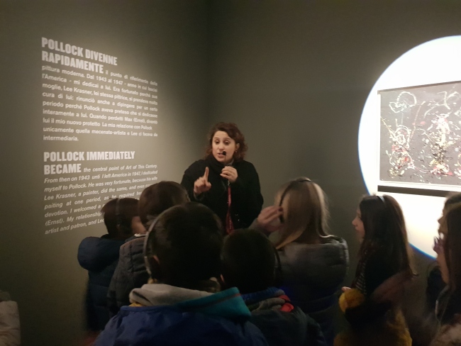 La prima cosa che voglio raccontarvi a proposito della nostra visita guidata per bambini alla mostra di Pollock al Vittoriano è che la nostra guida è stata veramente bravissima, Monica storica dell’arte, nel team di Un soffio d’arte, ha accompagnato bambini e adulti per tutto il percorso della mostra coinvolgendoli nell’osservazione critica delle opere esposte, invitandoli ad osservare, commentare, incoraggiandoli ad esprimere le loro opinioni su quanto presentato e raccontando loro aneddoti e notizie storiche alla portata dei bambini, ma anche dei grandi.