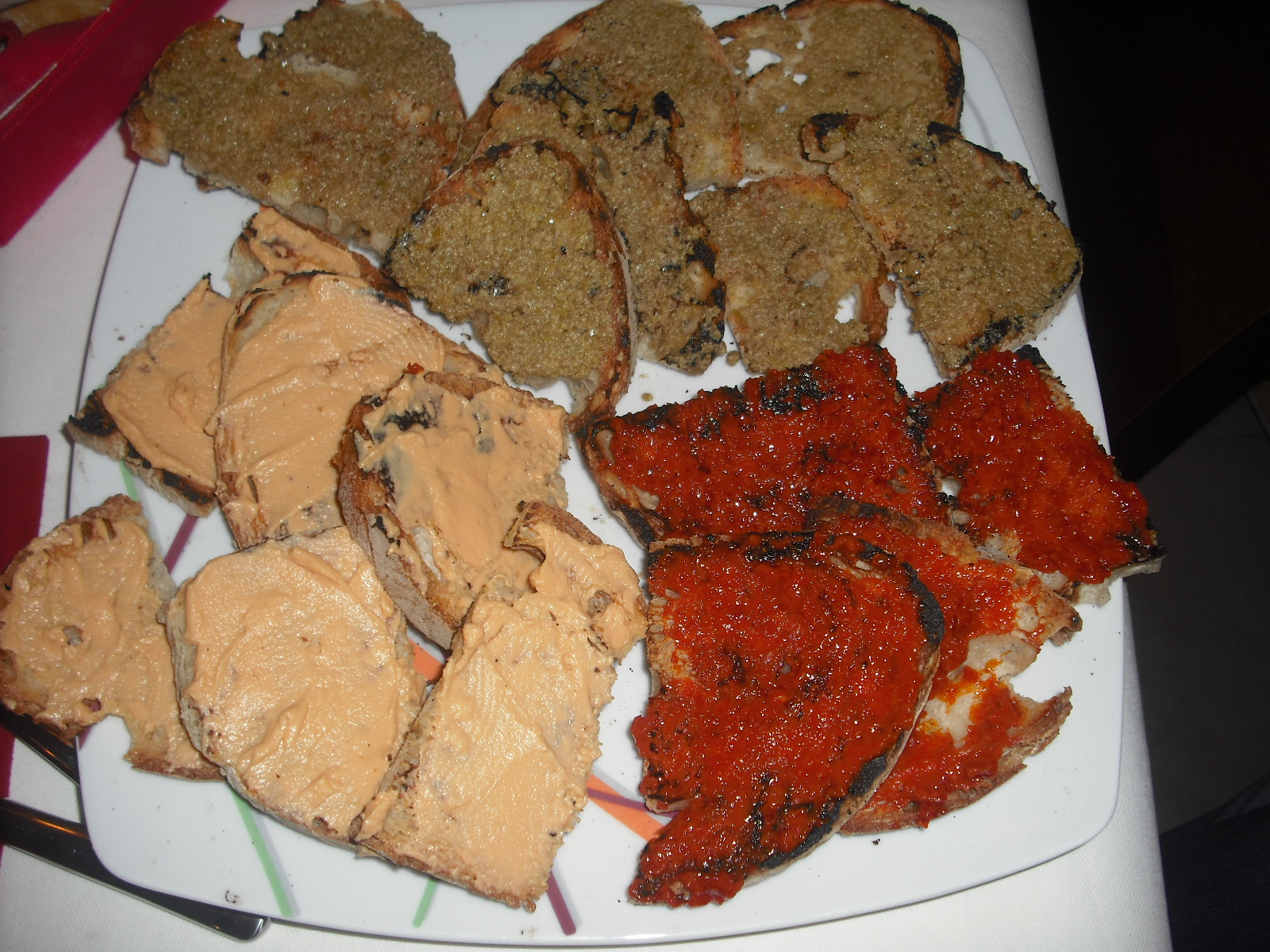 Bruschettine con salsa di olive, peperoni piccanti e paté di salmone.