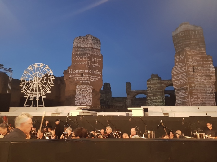 Lo spettacolo è creato appositamente per gli ampi spazi delle Terme di Caracalla, le scenografie sono stupefacenti: avendo come sfondo due colonne delle terme, Peparini da grande maestro quale è riesce a mettere in scena una Verona pazzesca, portandoci realmente tra le strade della città e nel meraviglioso palazzo dei Capuleti per una indimenticabile scena del memorabile ballo in cui Giulietta e Romeo si conoscono.