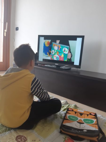 Il materiale ricevuto dalle famiglie contiene un video, con le attività che normalmente i bambini svolgono in classe, alcuni specifici file audio relativi a queste attività e un documento esplicativo con istruzioni e consigli. Ogni settimana stiamo ricevendo via mail link a nuovi contenuti ed Edoardo è molto felice tanto che ogni volta che gli annuncio che ci sono nuovi materiali da Kids&Us per lui è quasi come fosse festa.