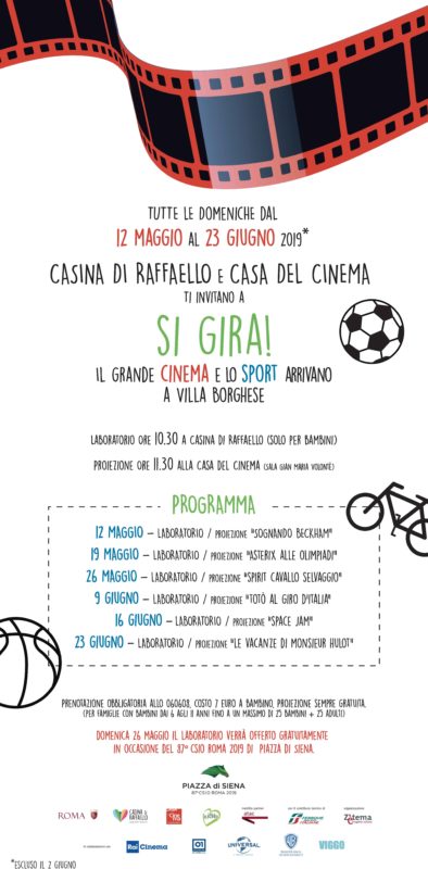 Casa del Cinema e Casina Raffaello aprono le porte di una vera sala cinematografica (la Sala Volonté a Largo Marcello Mastroianni 1) ai piccoli spettatori – e ai loro accompagnatori – dei laboratori della nuova iniziativa didattica Si Gira! Ogni domenica, a partire dal 12 maggio e fino al 23 giugno, i bambini dai 6 agli 11 anni, potranno partecipare alle attività di disegno ispirate ai temi dello sport in programma alle ore 10.30 nello Spazio Arte e Creatività dell’Assessorato alla Persona, Scuola e Comunità Solidale. Cosa si può fare in famiglia in un parco come Villa Borghese così grande e verde? I partecipanti lo proveranno a scoprire creando un ritratto delle attività all’aria aperta che si possono praticare all’interno della Villa: dallo sfrecciare in bici lungo la Valle dei platani a tirare un calcio al pallone nel prato vicino al Carosello, fino ad immaginare di far volare un aquilone nello spazio libero di Piazza di Siena. Tanti colori, immagini e creatività da riprodurre su carta prima di trasferirsi nell’adiacente Casa del Cinema dove la mattinata proseguirà davanti ad un bel film. Alle ore 11.30, infatti, nella Sala Gian Maria Volontè, il tema sportivo sarà declinato in termini cinematografici grazie ad una rassegna appositamente pensata per accompagnare per mano sia i bambini più piccoli che i giovani adolescenti, nei diversi mondi sportivi che ciascuno può praticare.
