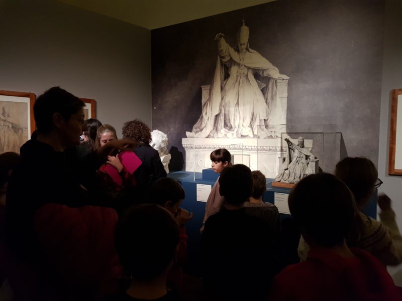La visita guidata per bambini dell’Associazione La Mage alla mostra Canova. Eterna bellezza ha portato i bambini mano nella mano alla scoperta di questo grande artista raccontando le sue origini venete, la sua vita cresciuto dai nonni che con tanti sacrifici lo avevano fatto studiare, la sua venuta a Roma, l’incontro con l’arte classica e il suo desiderio di produrre opere immortali che lo spingeva a lavorare tantissimo sul disegno poi sui modellini in creta, poi sui modellini in gesso e infine sul marmo che veniva sbozzato dai suoi collaboratori e poi rifinito da lui.